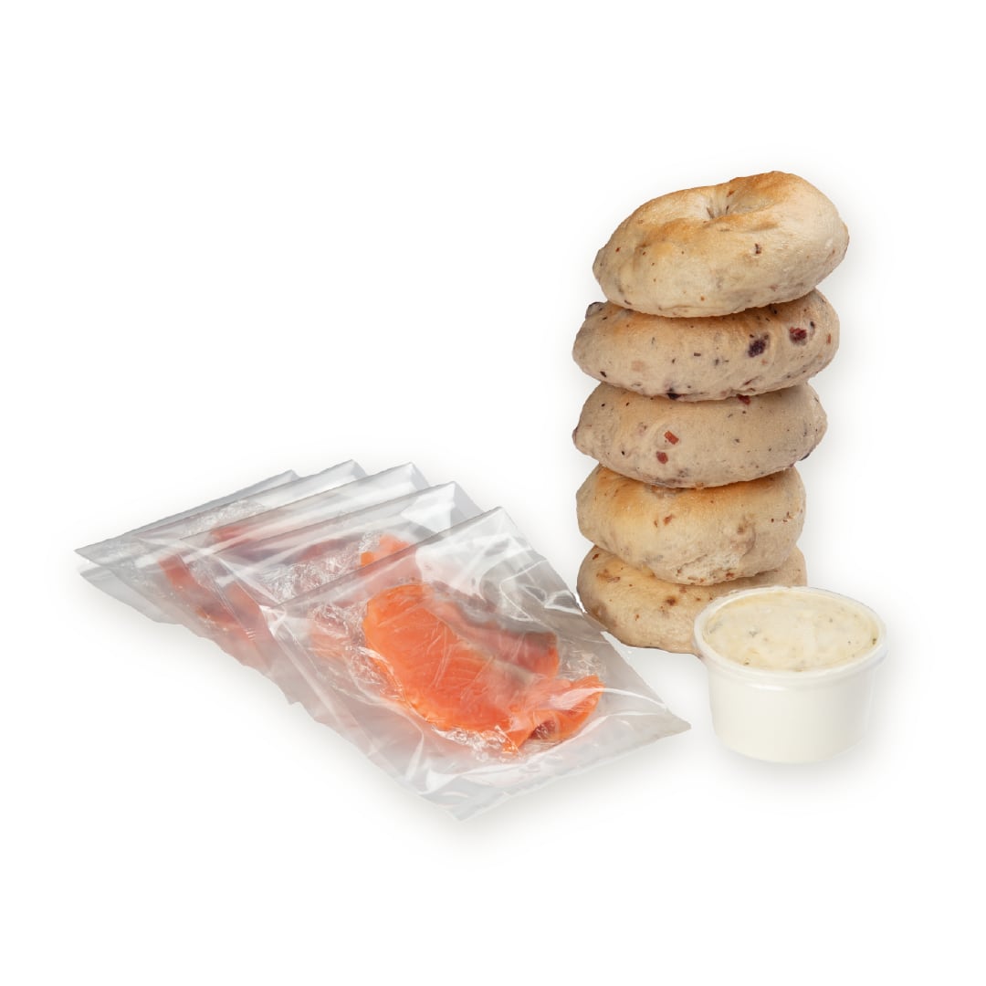卵・バター不使用の自家製ベーグルをアソートで5個と、サンド用のスモークサーモンを5パック、特製クリームチーズディップを1カップをセットでお届けします。スモークサーモンが小分けになっているので、朝食やランチのたびに食べたい分だけお使いいただけます。お好みでレタスやきゅうり、アボカドなどを追加でサンドしてどうぞ。