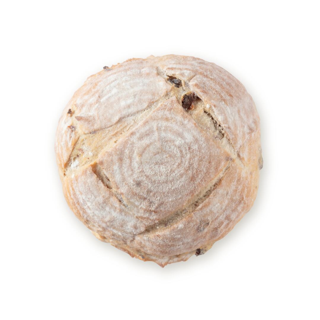 地元・岐阜県産の小麦を使った低温熟成生地にレーズンが溶けるほどしっかりと練り込んでいるため、パン生地全体に芳醇な風味が広がっています。ラタンのバヌトン(籐製のカゴ)で発酵・成形をしているのでハード系のパンのようなビジュアルながら、ソフトフランスパン感覚の軽い食感が特徴です。食事にも合うほんのりとした甘さで、さんたべーるの実店舗でもおかわり人気の高い一品です。